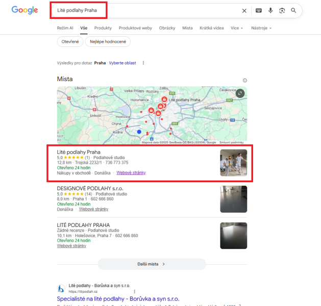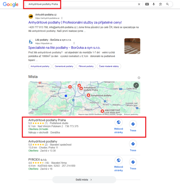 Klienta jsme původně oslovili s nabídkou pronájmu firemních zápisů na Google s klíčovým slovem "Anhydritové podlahy Praha" a "Lité podlahy Praha". Ty jsme zpracovali a klientovi je pronajímáme.