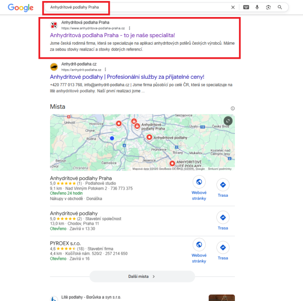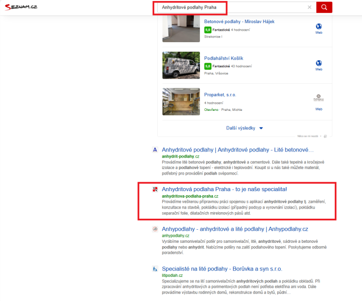 Pro klienta je klíčové, aby se jeho web: Anhydritová podlaha Praha - to je naše specialita! zobrazoval na Google i na Seznamu na klíčové slovo "Anhydritové podlahy Praha". Díky naší optimalizaci jsme v obou vyhledávačích na skvělých pozicích.