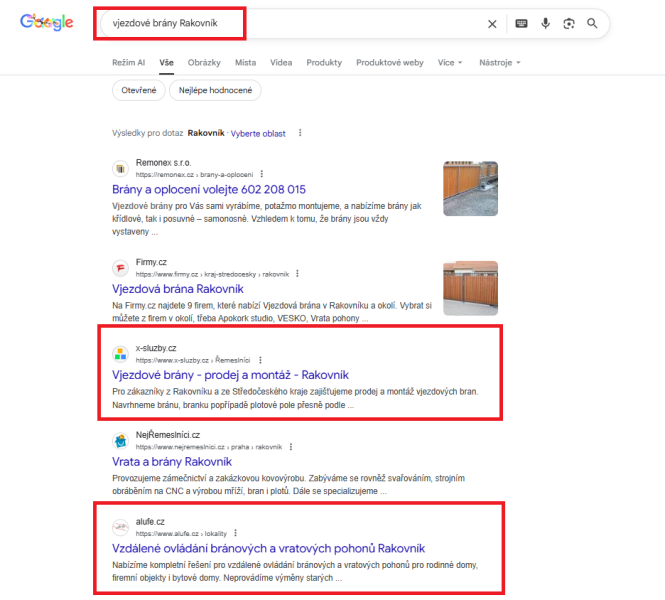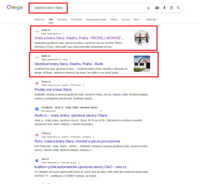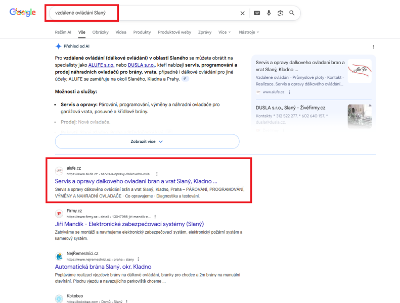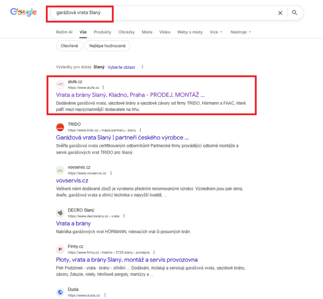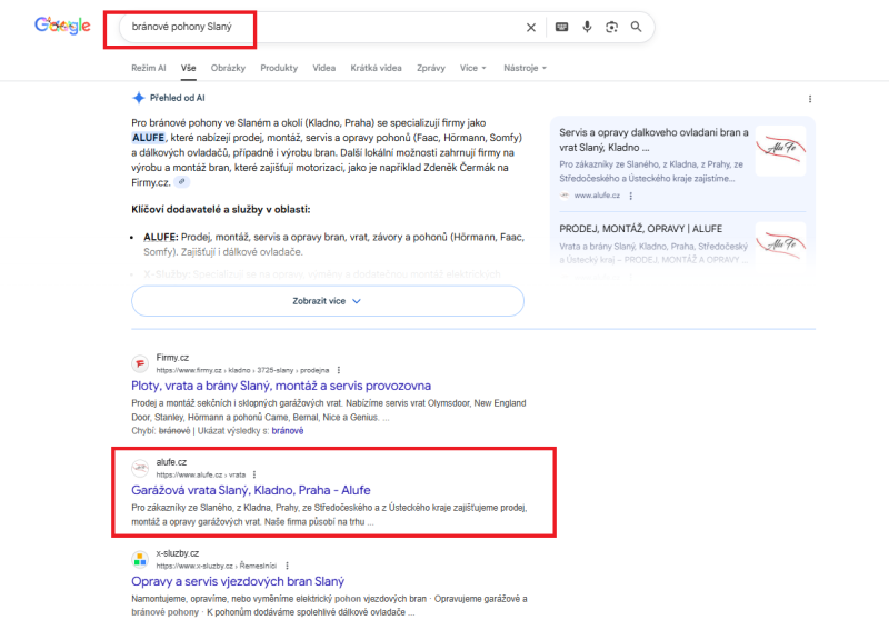 Součástí spolupráce byla také optimalizace webových stránek: Vrata a brány Slaný, Kladno, Praha - PRODEJ, MONTÁŽ, OPRAVY | ALUFE, které jsme upravili tak, aby odpovídaly vyhledávacím dotazům týkajícím se garážových vrat, vjezdových bran a pohonů ve Slaném a okolí. Zaměřili jsme se na strukturu obsahu, technické SEO i doplnění důležitých prvků, které podporují důvěryhodnost a konverze. Výsledkem je web s pevnou pozicí v organickém vyhledávání a stabilním přísunem relevantních návštěv, které se reálně proměňují v poptávky.