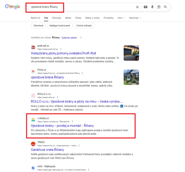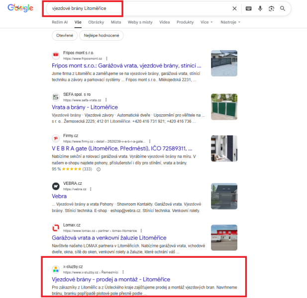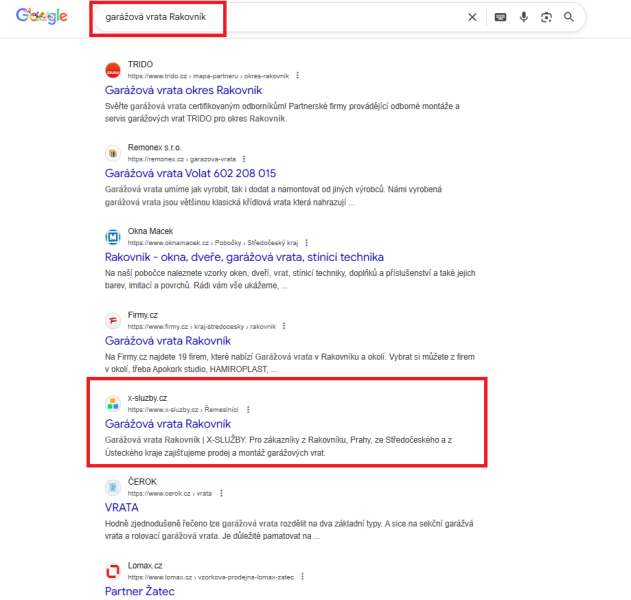 Pro klienta jsme kompletně optimalizovali firemní zápis na Google, a to přímo na klíčové slovo „garážová vrata Slaný“. Zápis jsme doplnili o kvalitní fotografie, přesné kategorie, popisy služeb i strukturované informace, které Google preferuje. Díky tomu se profil dnes zobrazuje na první straně ve výsledcích vyhledávání, což výrazně pomáhá získávat nové poptávky právě z okolí Slaného.