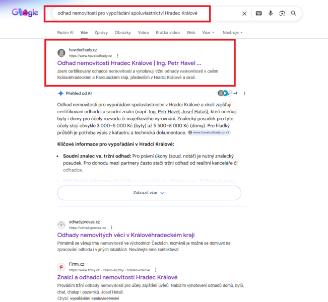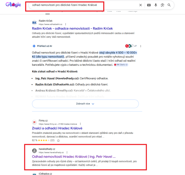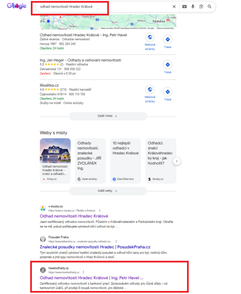 Pro podporu viditelnosti ve vyhledávání jsme využili silný firemní zápis na Google, který se zobrazuje na první stránce výsledků vyhledávání pro klíčové spojení „odhad nemovitosti Hradec Králové“.