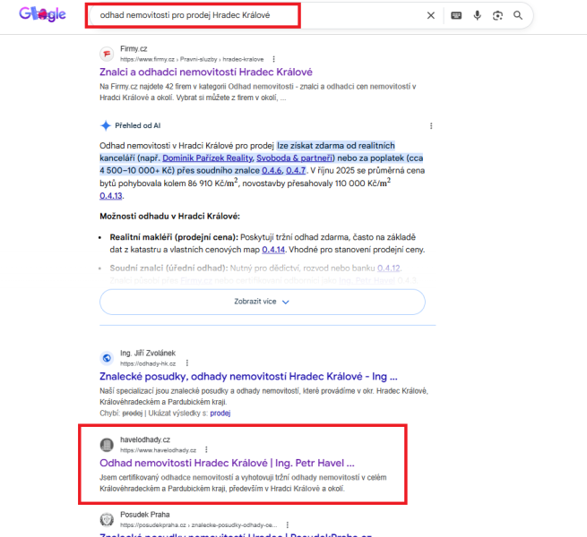 Pro klienta, který působí jako certifikovaný odhadce nemovitostí v Hradci Králové, jsme řešili zlepšení jeho online viditelnosti ve vyhledávání. Cílem bylo zajistit, aby se potenciální klienti z regionu mohli snadno dostat k informacím o službách a jednoduše navázat kontakt.