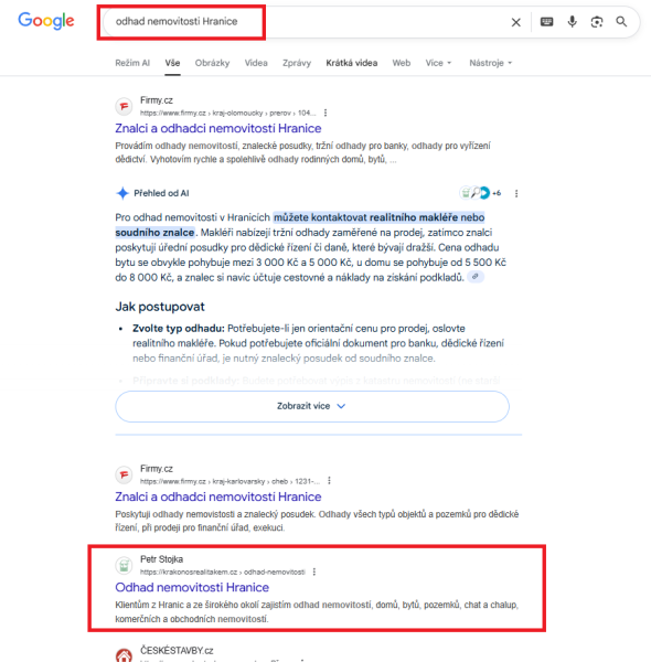 Klienta jsme původně oslovili s nabídkou pronájmu firemního zápisu na Google. Klient měl zájem o klíčové slovo "Odhad nemovitosti Olomouc", které jsme vytvořili a klientovi ho pronajímáme.