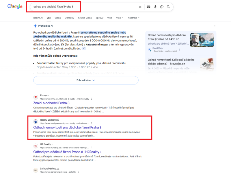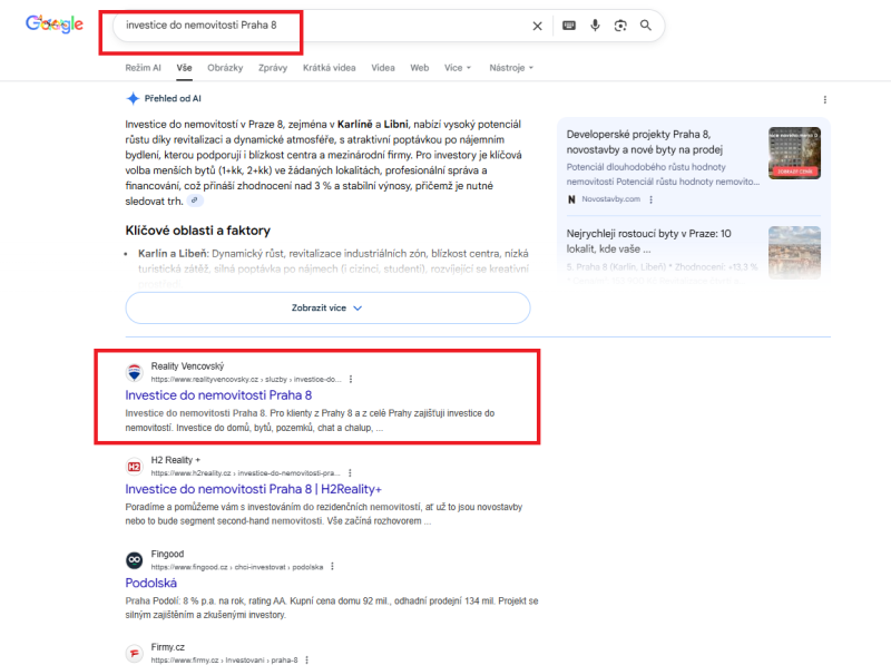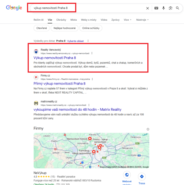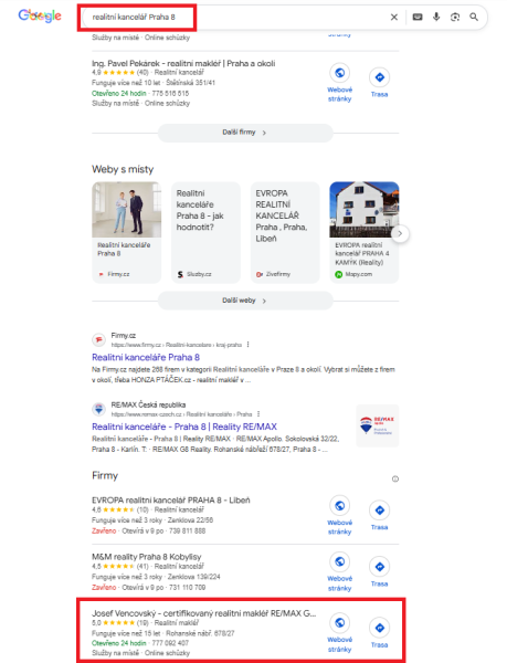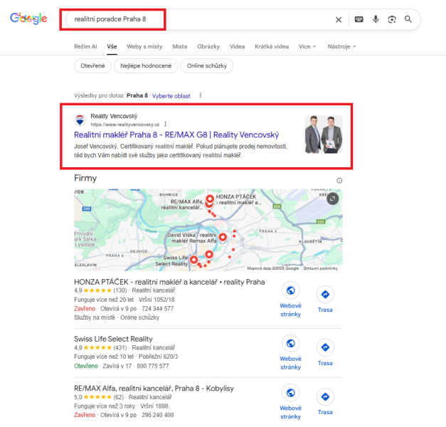Pro realitního makléře působícího v Praze 8 jsme kompletně upravili jeho online prezentaci tak, aby byl dobře vidět přesně tam, kde skutečně podniká. Optimalizovali jsme jeho Google firemní zápis, profil na Firmy.cz a také webové stránky. Společně jsme se strategicky rozhodli cílit výhradně na Prahu 8 – tedy oblast, kde má klient kancelář i kontaktní adresy. Místo boje o celou Prahu, kde by byla konkurence obrovská, jsme zvolili efektivnější cestu: být jednička v užší lokalitě, než průměr v celém městě. A to se ukazuje jako velmi funkční strategie.
