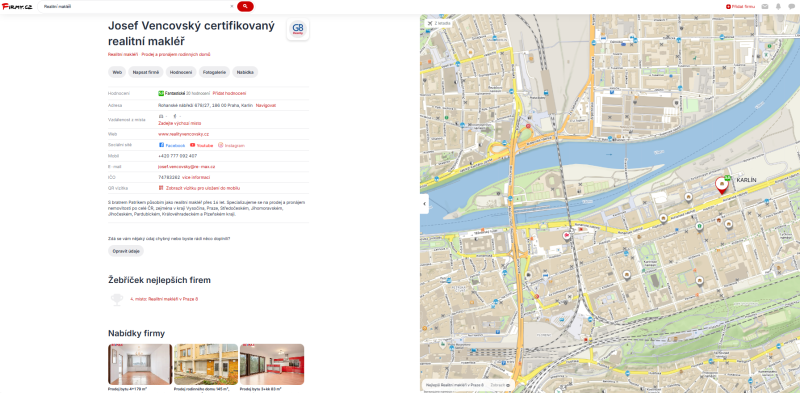 U profilu na Firmy.cz: Josef Vencovský certifikovaný realitní makléř (Praha, Karlín) • Firmy.cz jsme provedli kompletní kontrolu údajů, doplnění kategorií, přidání kvalitních fotografií i optimalizaci popisu služeb. Seznam i Mapy.cz mají v Česku stále silný vliv, a proto je důležité být zde správně zařazený — navíc opět cíleně na Prahu 8. Díky tomu se klient zobrazuje lidem, kteří hledají realitní služby v jeho nejbližším okolí, což má přímý dopad na počet poptávek.