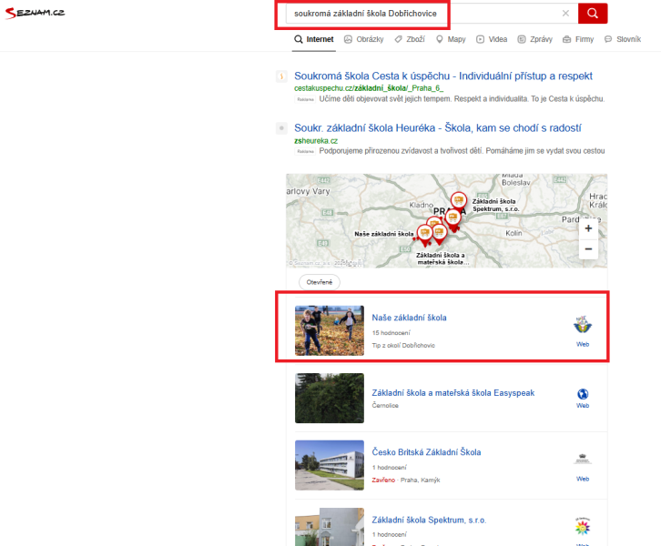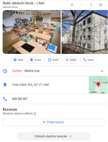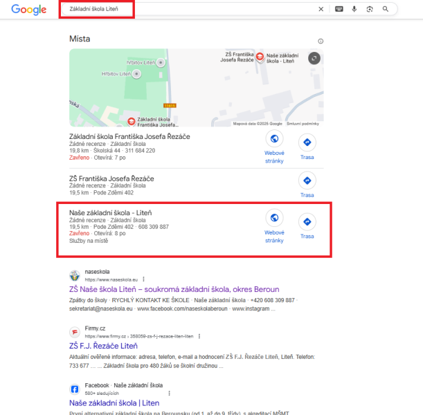 Základní škola svůj firemní zápis na Google měla, ale ten se zobrazoval pouze při přesném zadání názvu školy. Když člověk hledal "Základní škola Liteň", tak dohledatelný nebyl.