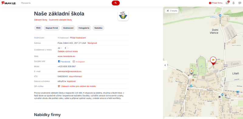 Základní škola měla svůj profil na Firmy.cz: Naše základní škola (Liteň) • Firmy.cz, ale nebyl na 100% vyplněn. Zápis jsme vyplnili a optimalizovali.