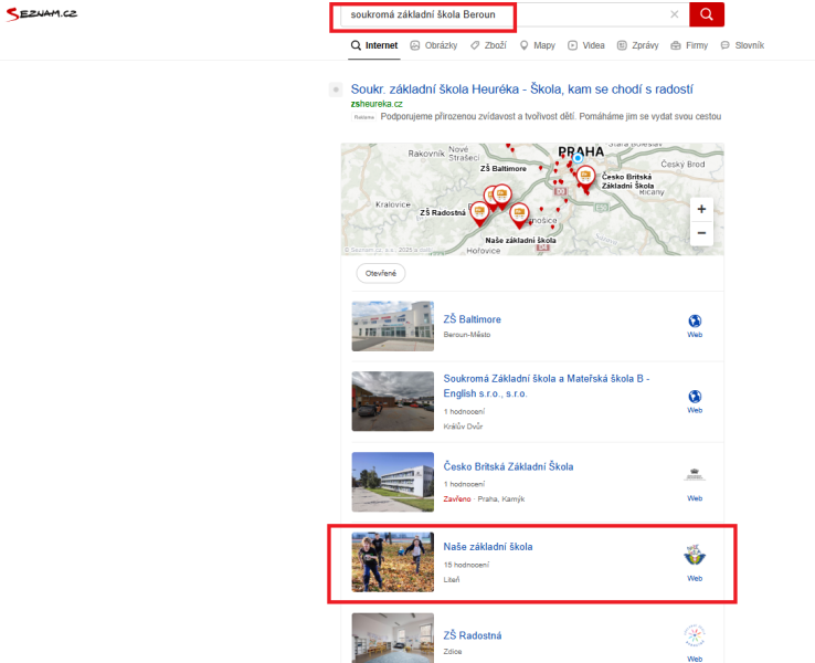 Základní škola má své webové stránky: ZŠ Naše škola Liteň – soukromá základní škola, okres Beroun, které jsme celé aktualizovali. A to jak v rámci informací, tak i v rámci vizuálu. Stejně tak jsme web optimalizovali a primárně jej cílíme na město Beroun. Po týdnu se zobrazujeme na skvělé pozici.